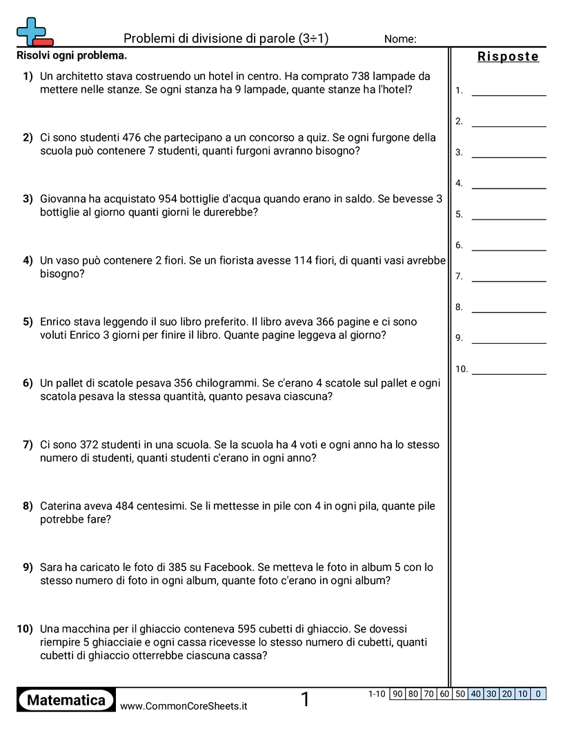 Schede di lavoro gratuite di math per 4ª Elementare (4nbt6) su Problemi di divisione di parole (3÷1) . Ogni scheda contiene 10 esercizi con soluzioni ed è ideale per insegnanti e istruzione a casa. Puoi scaricare il PDF, creare flashcard o impostarlo per l'apprendimento online.