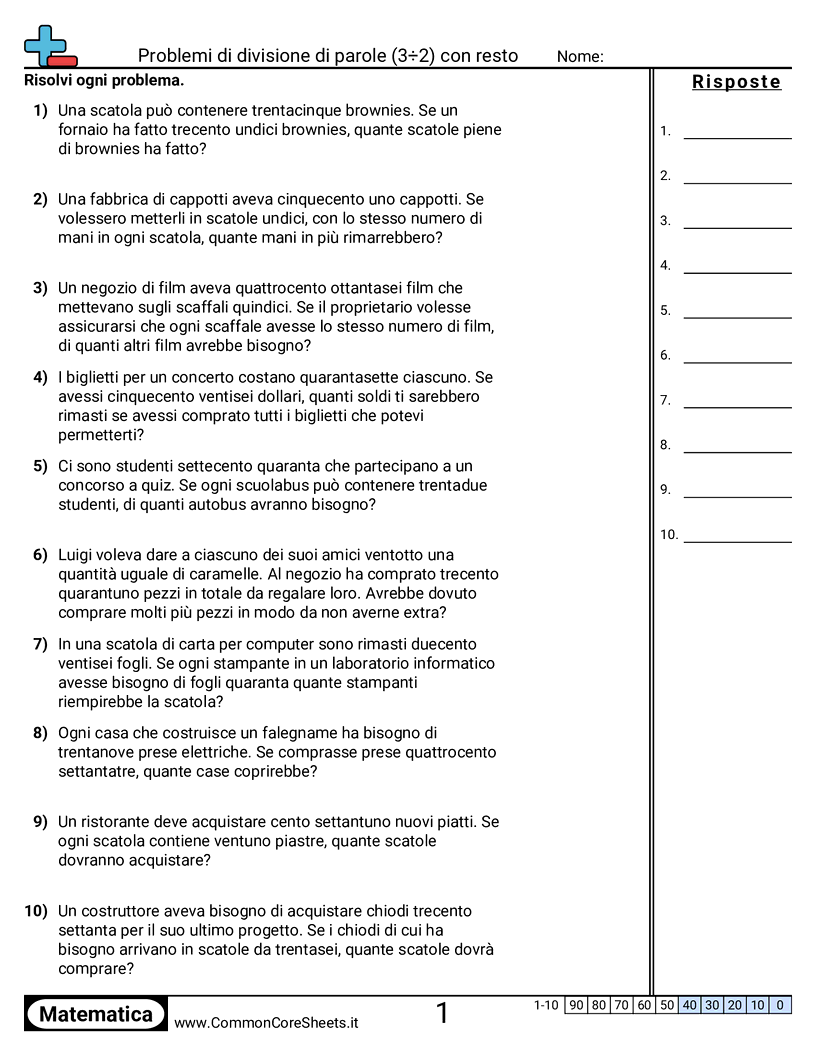 Schede di lavoro gratuite di math per 5ª Elementare (5nbt6) su Problemi di divisione di parole (3÷2) con resto. Ogni scheda contiene 10 esercizi con soluzioni ed è ideale per insegnanti e istruzione a casa. Puoi scaricare il PDF, creare flashcard o impostarlo per l'apprendimento online.