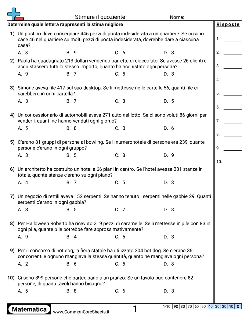 Schede di lavoro gratuite di math per 4ª Elementare (4nbt6) su Stimare il quoziente. Ogni scheda contiene 10 esercizi con soluzioni ed è ideale per insegnanti e istruzione a casa. Puoi scaricare il PDF, creare flashcard o impostarlo per l'apprendimento online.