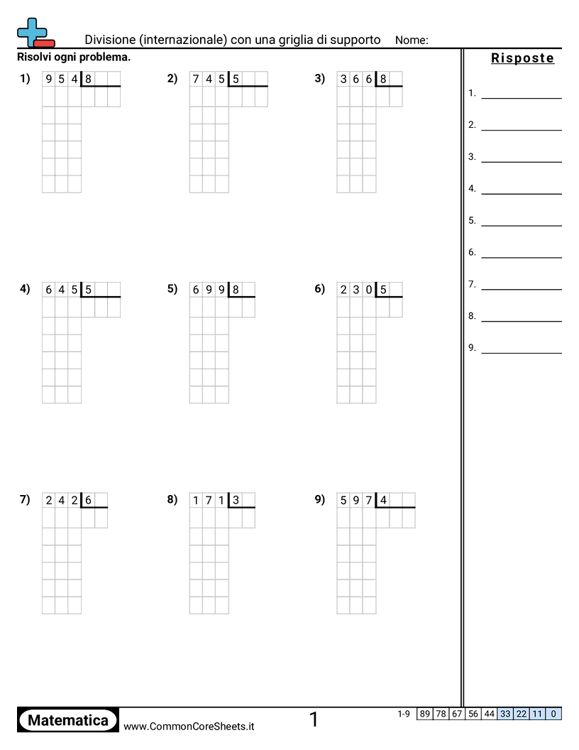 Schede di lavoro gratuite di math su Divisione (internazionale) con una griglia di supporto. Ogni scheda contiene 9 esercizi con soluzioni ed è ideale per insegnanti e istruzione a casa. Puoi scaricare il PDF, creare flashcard o impostarlo per l'apprendimento online.