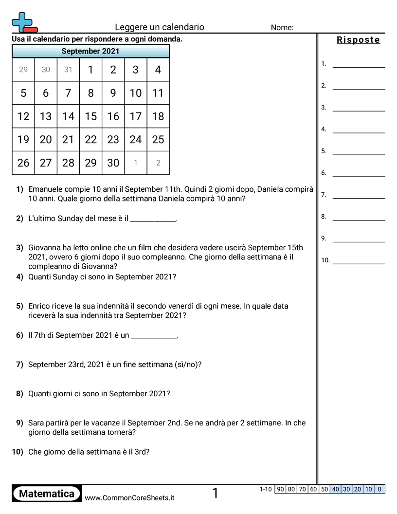 Schede di lavoro gratuite di math su Leggere un calendario. Ogni scheda contiene 10 esercizi con soluzioni ed è ideale per insegnanti e istruzione a casa. Puoi scaricare il PDF, creare flashcard o impostarlo per l'apprendimento online.