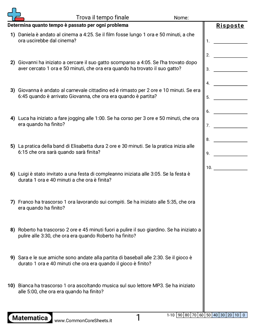 Schede di lavoro gratuite di math per 3ª Elementare (3md1) su Trova il tempo finale. Ogni scheda contiene 10 esercizi con soluzioni ed è ideale per insegnanti e istruzione a casa. Puoi scaricare il PDF, creare flashcard o impostarlo per l'apprendimento online.