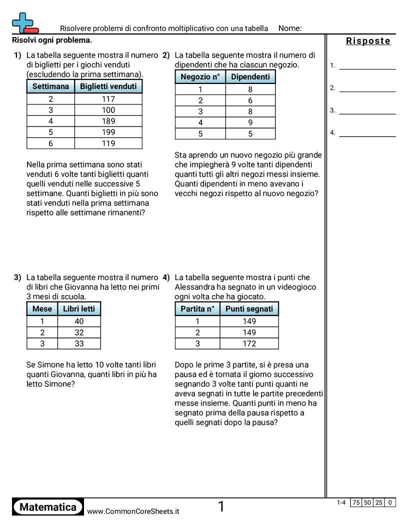 Schede di lavoro gratuite di math per 4ª Elementare (4oa2) su Risolvere problemi di confronto moltiplicativo con una tabella. Ogni scheda contiene 4 esercizi con soluzioni ed è ideale per insegnanti e istruzione a casa. Puoi scaricare il PDF, creare flashcard o impostarlo per l'apprendimento online.