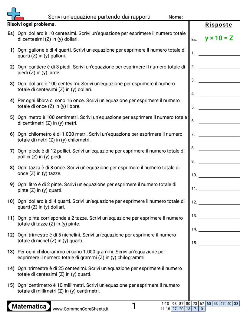 Schede di lavoro gratuite di math per 1ª Media (6rp3d) su Scrivi un'equazione partendo dai rapporti. Ogni scheda contiene 15 esercizi con soluzioni ed è ideale per insegnanti e istruzione a casa. Puoi scaricare il PDF, creare flashcard o impostarlo per l'apprendimento online.