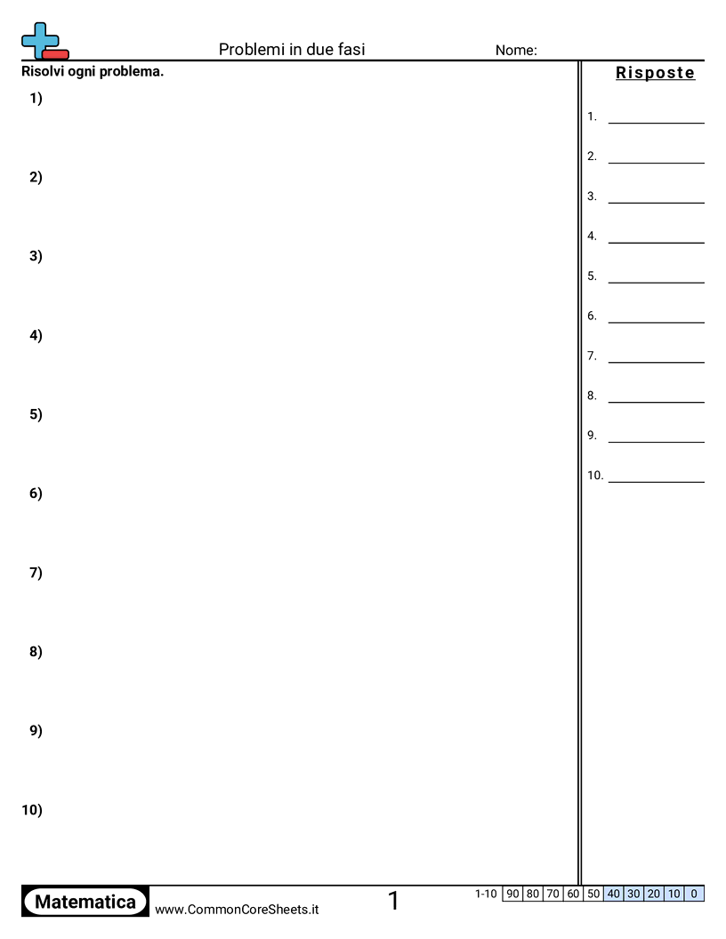 Schede di lavoro gratuite di math per 2ª Elementare (2oa1) su Problemi in due fasi . Ogni scheda contiene 10 esercizi con soluzioni ed è ideale per insegnanti e istruzione a casa. Puoi scaricare il PDF, creare flashcard o impostarlo per l'apprendimento online.