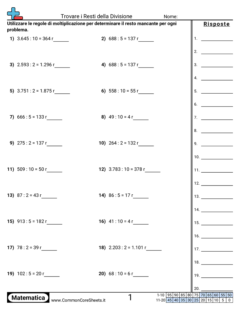 Schede di lavoro gratuite di math su Trovare i Resti della Divisione. Ogni scheda contiene 20 esercizi con soluzioni ed è ideale per insegnanti e istruzione a casa. Puoi scaricare il PDF, creare flashcard o impostarlo per l'apprendimento online.