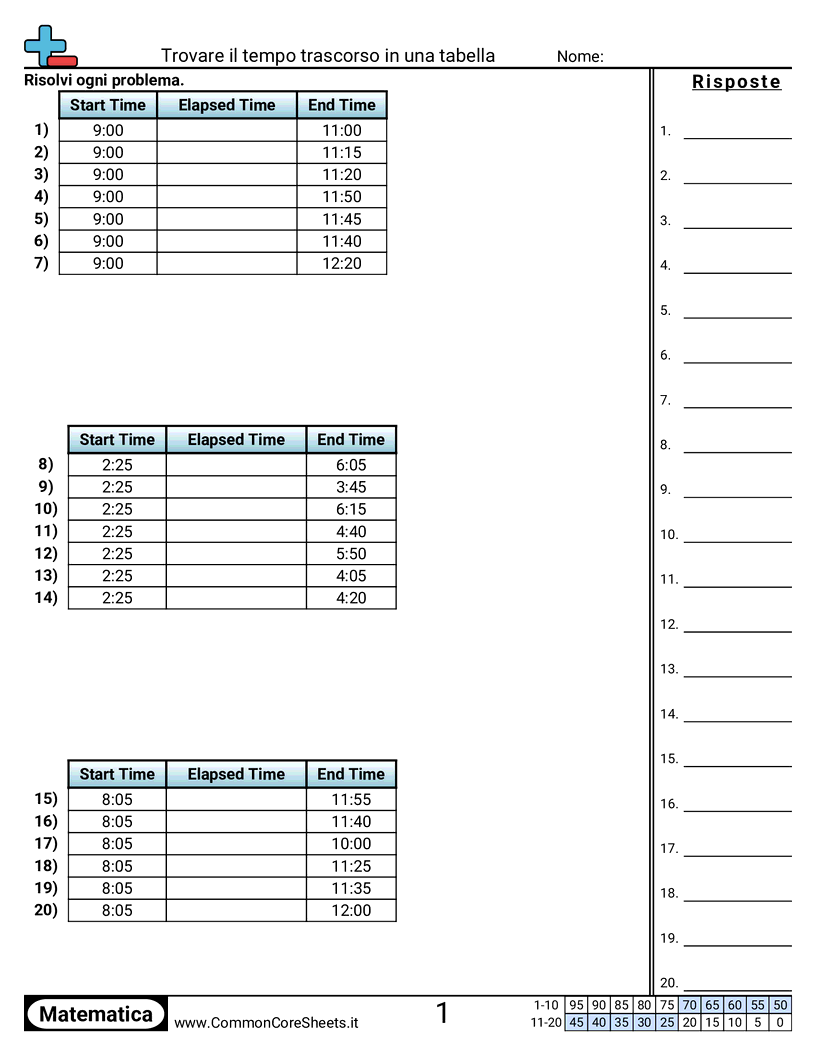 Schede di lavoro gratuite di math su Trovare il tempo trascorso in una tabella. Ogni scheda contiene 20 esercizi con soluzioni ed è ideale per insegnanti e istruzione a casa. Puoi scaricare il PDF, creare flashcard o impostarlo per l'apprendimento online.