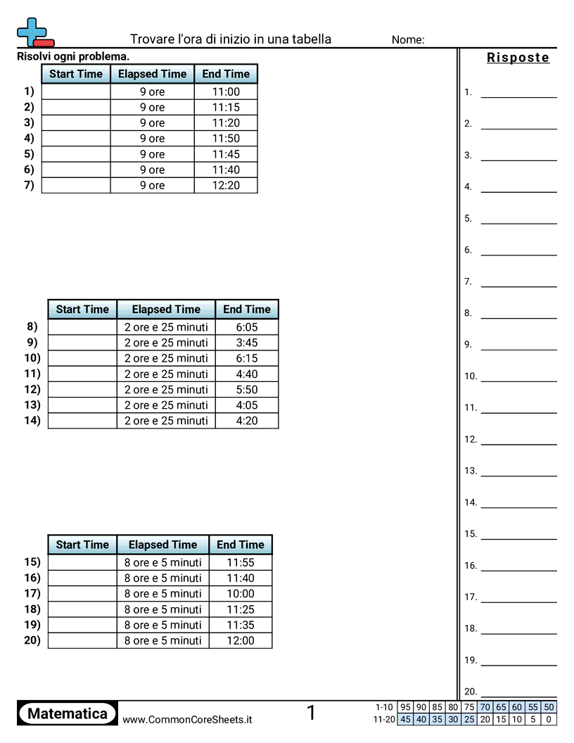 Schede di lavoro gratuite di math su Trovare l'ora di inizio in una tabella. Ogni scheda contiene 20 esercizi con soluzioni ed è ideale per insegnanti e istruzione a casa. Puoi scaricare il PDF, creare flashcard o impostarlo per l'apprendimento online.