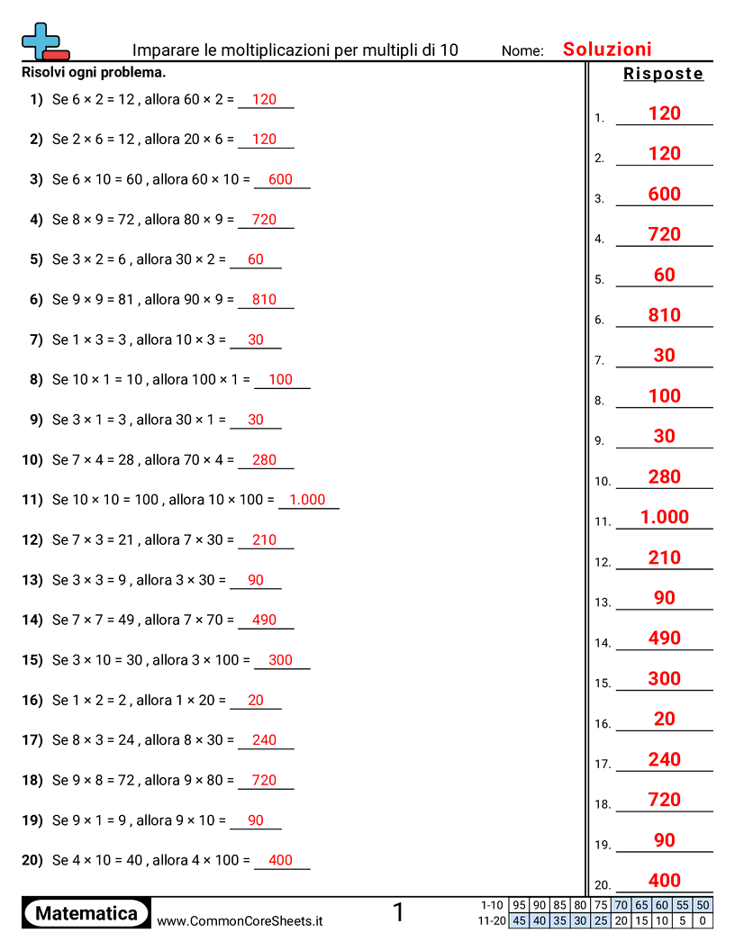 Schede di lavoro gratuite di math per 3ª Elementare (3oa1) su Imparare le moltiplicazioni per multipli di 10. Ogni scheda contiene 20 esercizi con soluzioni ed è ideale per insegnanti e istruzione a casa. Puoi scaricare il PDF, creare flashcard o impostarlo per l'apprendimento online.
