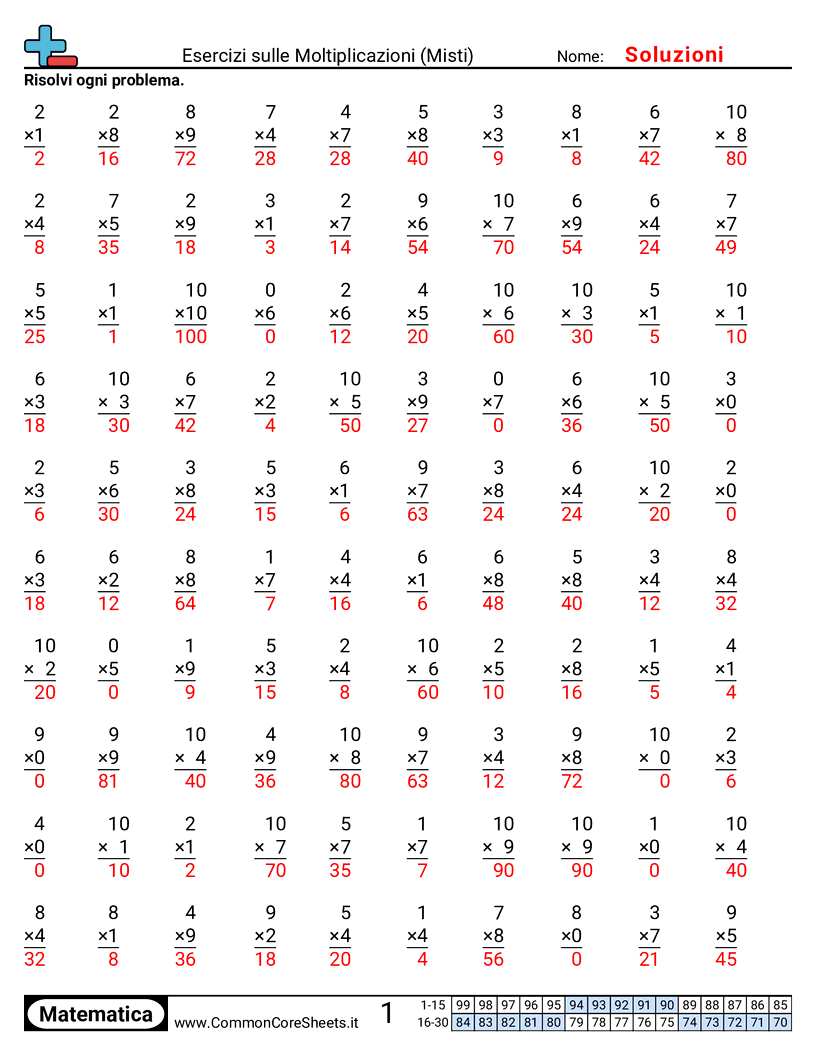 Ogni foglio di lavoro comprende 100 problemi di moltiplicazione da 1×1 fino a 10×10.