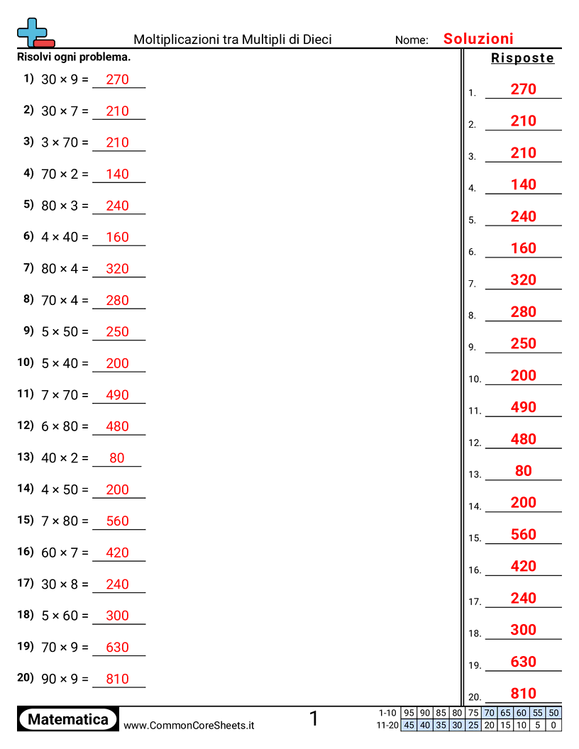 Ogni foglio di lavoro comprende 20 problemi moltiplica un numero ad una cifra per un multiplo di dieci.