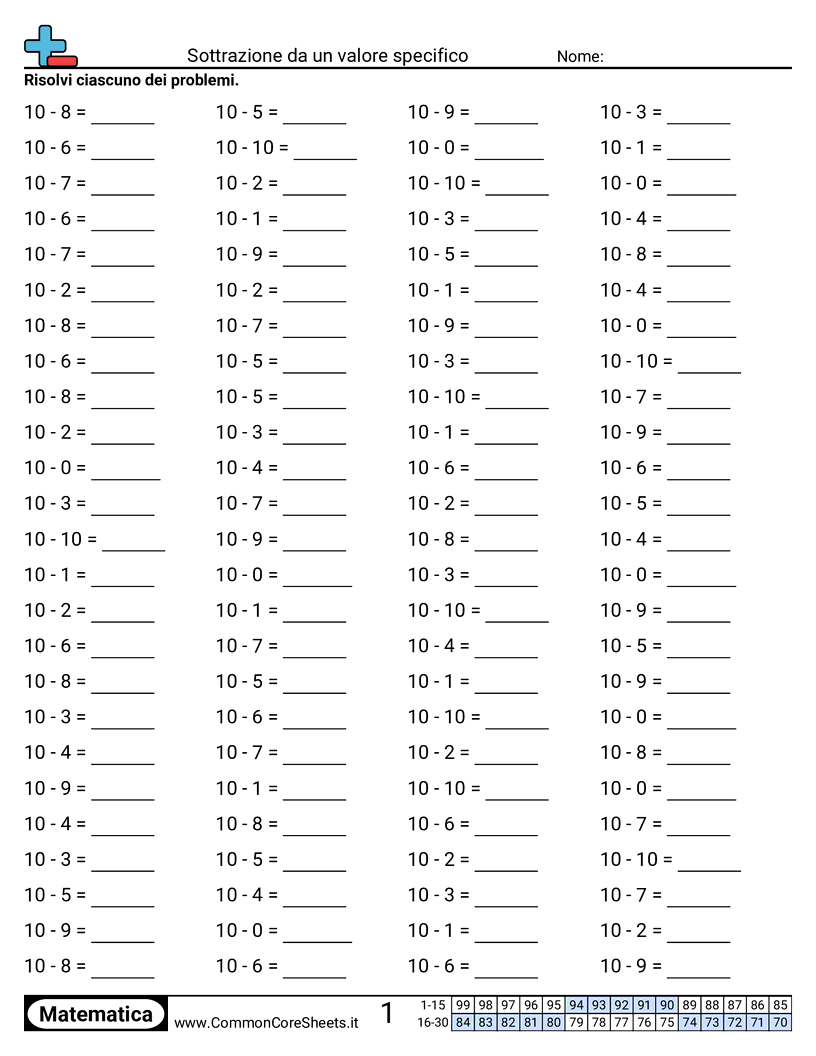 Schede di lavoro gratuite di math per Scuola materna (koa5) su Sottrazione da un valore specifico. Ogni scheda contiene 100 esercizi con soluzioni ed è ideale per insegnanti e istruzione a casa. Puoi scaricare il PDF, creare flashcard o impostarlo per l'apprendimento online.