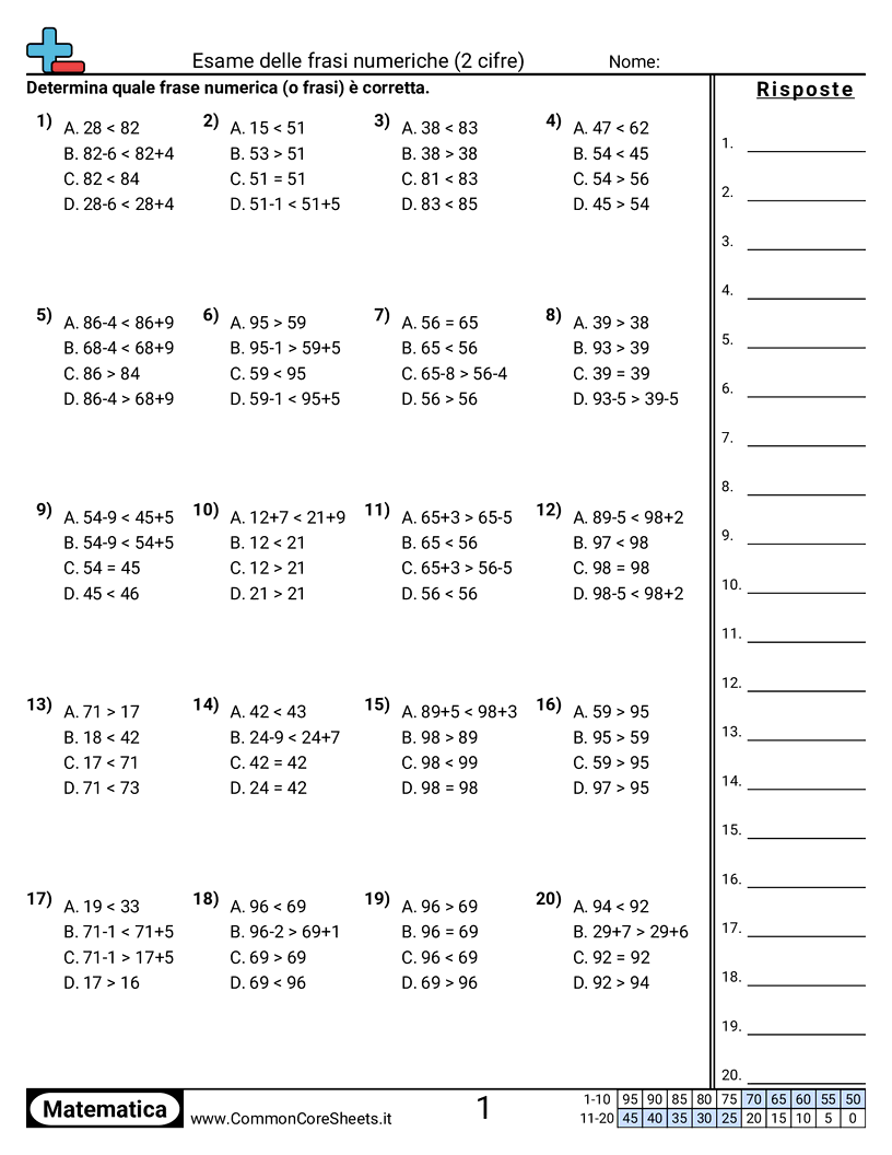 Schede di lavoro gratuite di math su Esame delle frasi numeriche (2 cifre) . Ogni scheda contiene 20 esercizi con soluzioni ed è ideale per insegnanti e istruzione a casa. Puoi scaricare il PDF, creare flashcard o impostarlo per l'apprendimento online.
