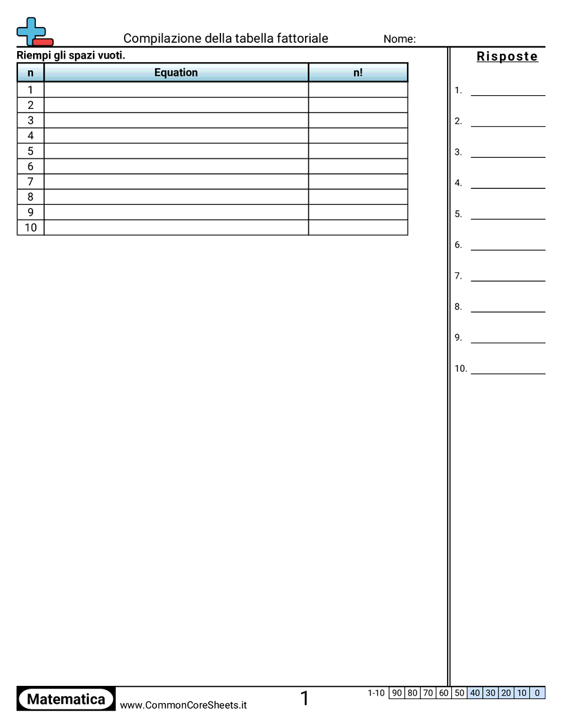 Schede di lavoro gratuite di math su Compilazione della tabella fattoriale. Ogni scheda contiene 10 esercizi con soluzioni ed è ideale per insegnanti e istruzione a casa. Puoi scaricare il PDF, creare flashcard o impostarlo per l'apprendimento online.