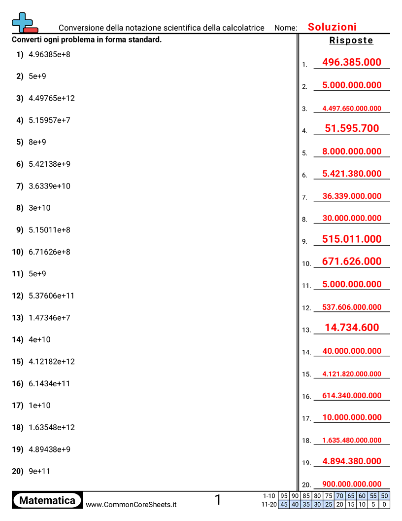 Schede di lavoro gratuite di math per 3ª Media (8ee4) su Conversione della notazione scientifica della calcolatrice. Ogni scheda contiene 20 esercizi con soluzioni ed è ideale per insegnanti e istruzione a casa. Puoi scaricare il PDF, creare flashcard o impostarlo per l'apprendimento online.