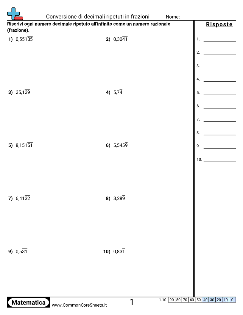 Schede di lavoro gratuite di math per 3ª Media (8ns1) su Conversione di decimali ripetuti in frazioni. Ogni scheda contiene 10 esercizi con soluzioni ed è ideale per insegnanti e istruzione a casa. Puoi scaricare il PDF, creare flashcard o impostarlo per l'apprendimento online.