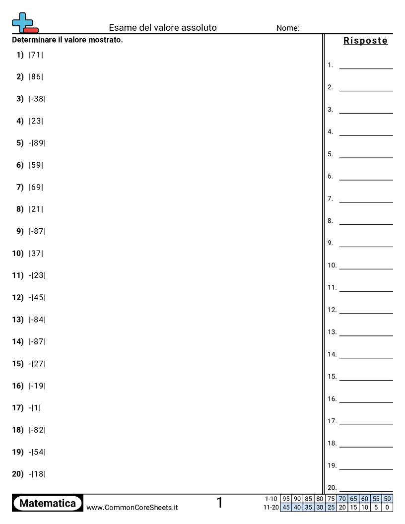 Schede di lavoro gratuite di math per 1ª Media (6ns7c) su Esame del valore assoluto. Ogni scheda contiene 20 esercizi con soluzioni ed è ideale per insegnanti e istruzione a casa. Puoi scaricare il PDF, creare flashcard o impostarlo per l'apprendimento online.