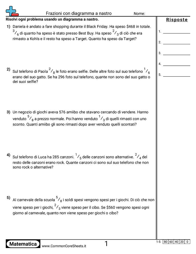 Schede di lavoro gratuite di math su Frazioni con diagramma a nastro. Ogni scheda contiene 5 esercizi con soluzioni ed è ideale per insegnanti e istruzione a casa. Puoi scaricare il PDF, creare flashcard o impostarlo per l'apprendimento online.