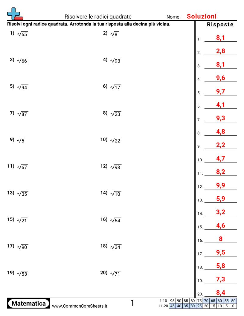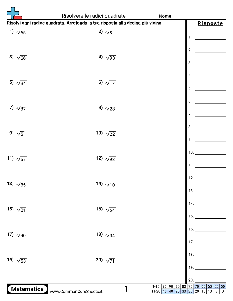Ogni foglio di lavoro comprende 20 problemi calcola le radici quadrate di ogni numero.