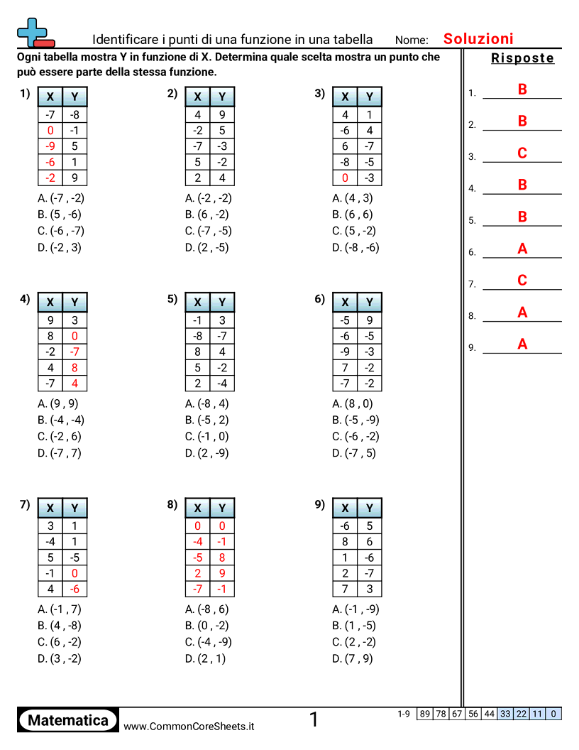 Schede di lavoro gratuite di math per 3ª Media (8f1) su Identificare i punti di una funzione in una tabella. Ogni scheda contiene 9 esercizi con soluzioni ed è ideale per insegnanti e istruzione a casa. Puoi scaricare il PDF, creare flashcard o impostarlo per l'apprendimento online.