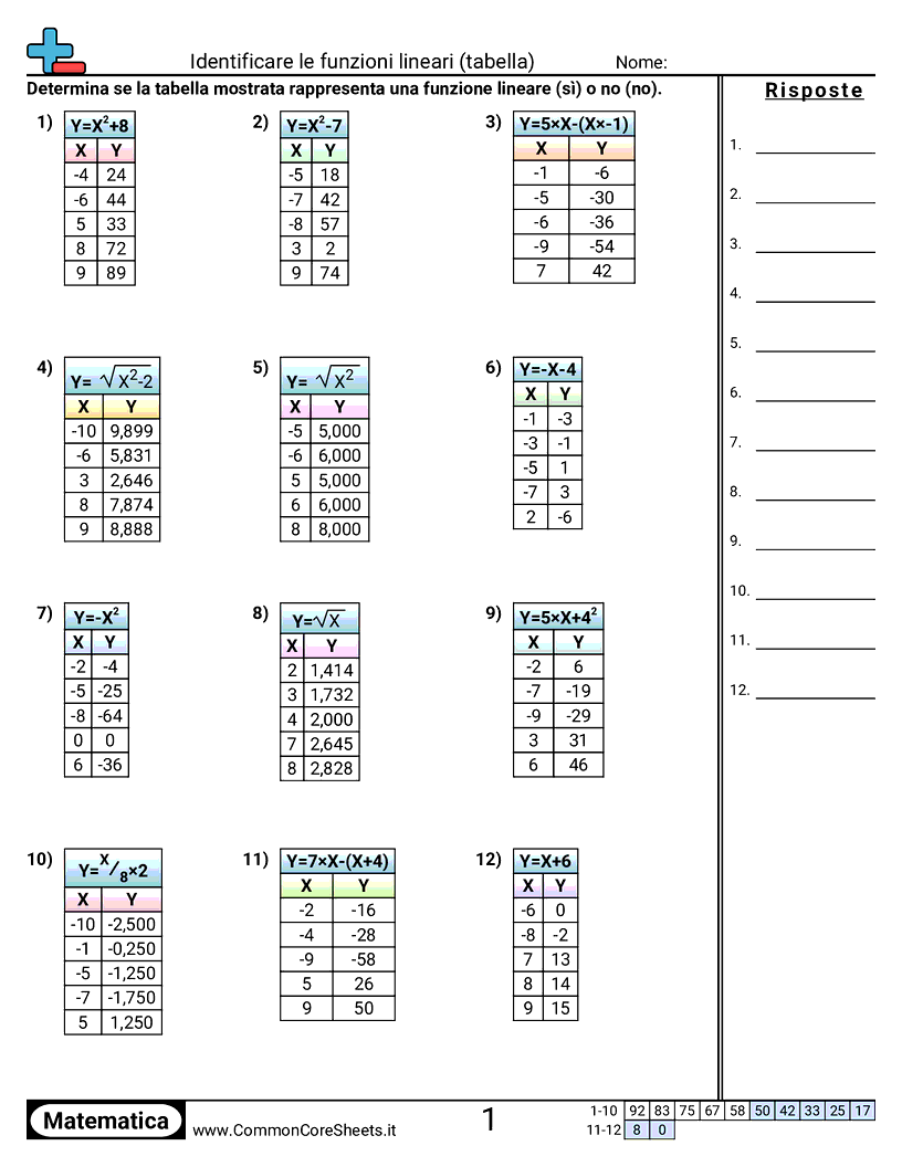 Schede di lavoro gratuite di math per 3ª Media (8f3) su Identificare le funzioni lineari (tabella). Ogni scheda contiene 12 esercizi con soluzioni ed è ideale per insegnanti e istruzione a casa. Puoi scaricare il PDF, creare flashcard o impostarlo per l'apprendimento online.