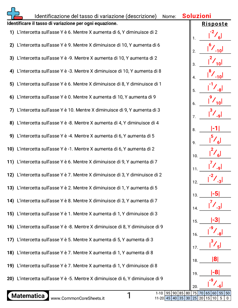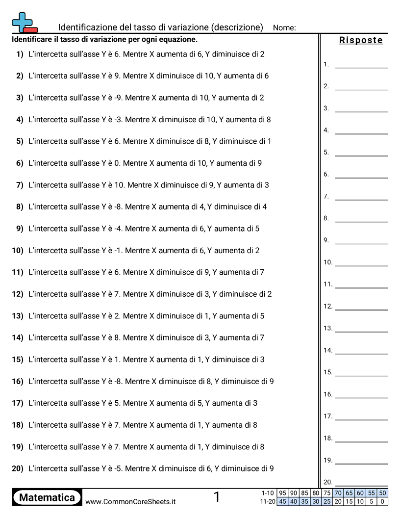 Schede di lavoro gratuite di math per 3ª Media (8f2) su Identificazione del tasso di variazione (descrizione). Ogni scheda contiene 20 esercizi con soluzioni ed è ideale per insegnanti e istruzione a casa. Puoi scaricare il PDF, creare flashcard o impostarlo per l'apprendimento online.