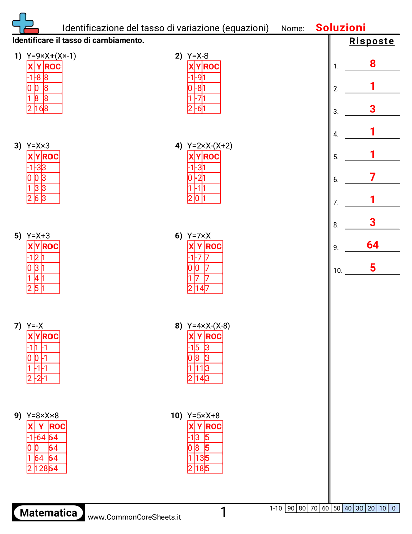 Schede di lavoro gratuite di math per 3ª Media (8f2) su Identificazione del tasso di variazione (equazioni). Ogni scheda contiene 10 esercizi con soluzioni ed è ideale per insegnanti e istruzione a casa. Puoi scaricare il PDF, creare flashcard o impostarlo per l'apprendimento online.