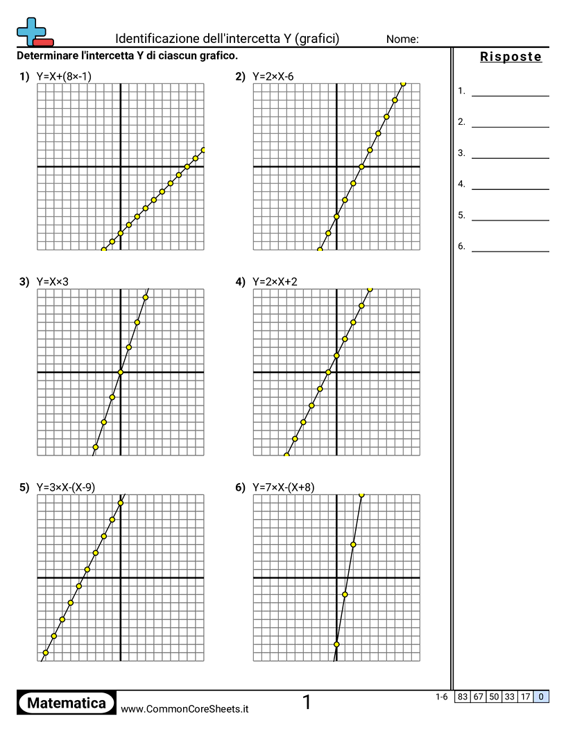 Schede di lavoro gratuite di math per 3ª Media (8f2) su Identificazione dell'intercetta Y (grafici). Ogni scheda contiene 6 esercizi con soluzioni ed è ideale per insegnanti e istruzione a casa. Puoi scaricare il PDF, creare flashcard o impostarlo per l'apprendimento online.