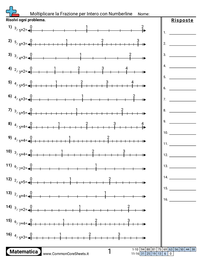 Schede di lavoro gratuite di math per 5ª Elementare (5nf4a) su Moltiplicare la Frazione per Intero con Numberline. Ogni scheda contiene 16 esercizi con soluzioni ed è ideale per insegnanti e istruzione a casa. Puoi scaricare il PDF, creare flashcard o impostarlo per l'apprendimento online.