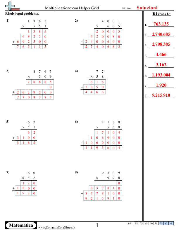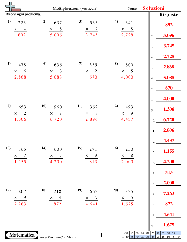 Moltiplicazioni in colonna 4 cifre × 1 cifra