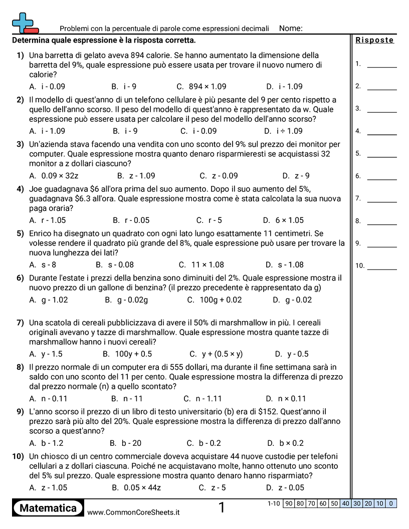Schede di lavoro gratuite di math per 2ª Media (7ee2) su Problemi con la percentuale di parole come espressioni decimali. Ogni scheda contiene 10 esercizi con soluzioni ed è ideale per insegnanti e istruzione a casa. Puoi scaricare il PDF, creare flashcard o impostarlo per l'apprendimento online.