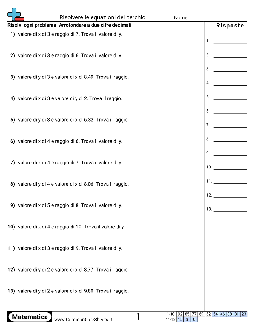 Schede di lavoro gratuite di math su Risolvere le equazioni del cerchio. Ogni scheda contiene 13 esercizi con soluzioni ed è ideale per insegnanti e istruzione a casa. Puoi scaricare il PDF, creare flashcard o impostarlo per l'apprendimento online.