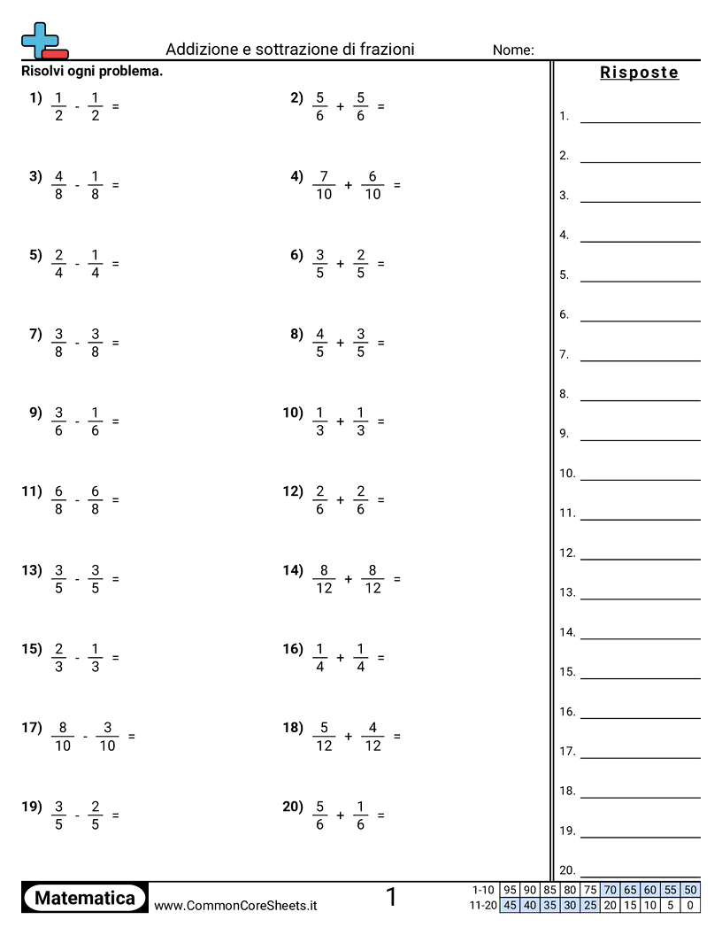Schede di lavoro gratuite di math su Addizione e sottrazione di frazioni . Ogni scheda contiene 20 esercizi con soluzioni ed è ideale per insegnanti e istruzione a casa. Puoi scaricare il PDF, creare flashcard o impostarlo per l'apprendimento online.