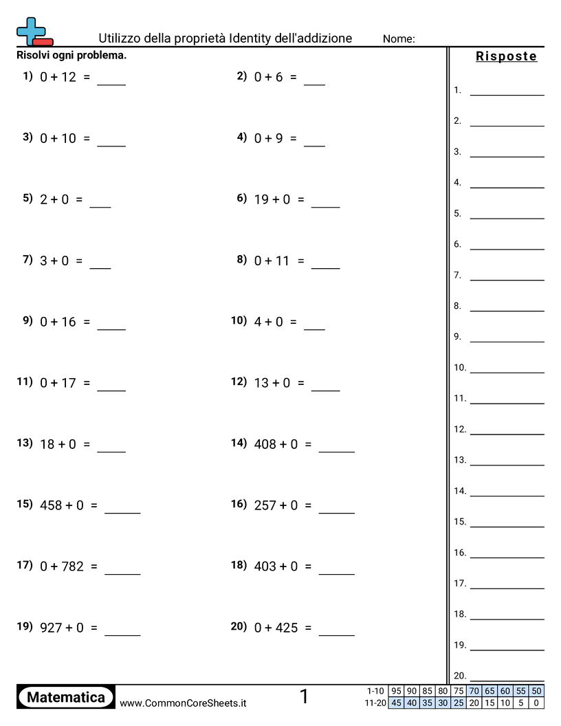 Schede di lavoro gratuite di math su Utilizzo della proprietà Identity dell'addizione. Ogni scheda contiene 20 esercizi con soluzioni ed è ideale per insegnanti e istruzione a casa. Puoi scaricare il PDF, creare flashcard o impostarlo per l'apprendimento online.