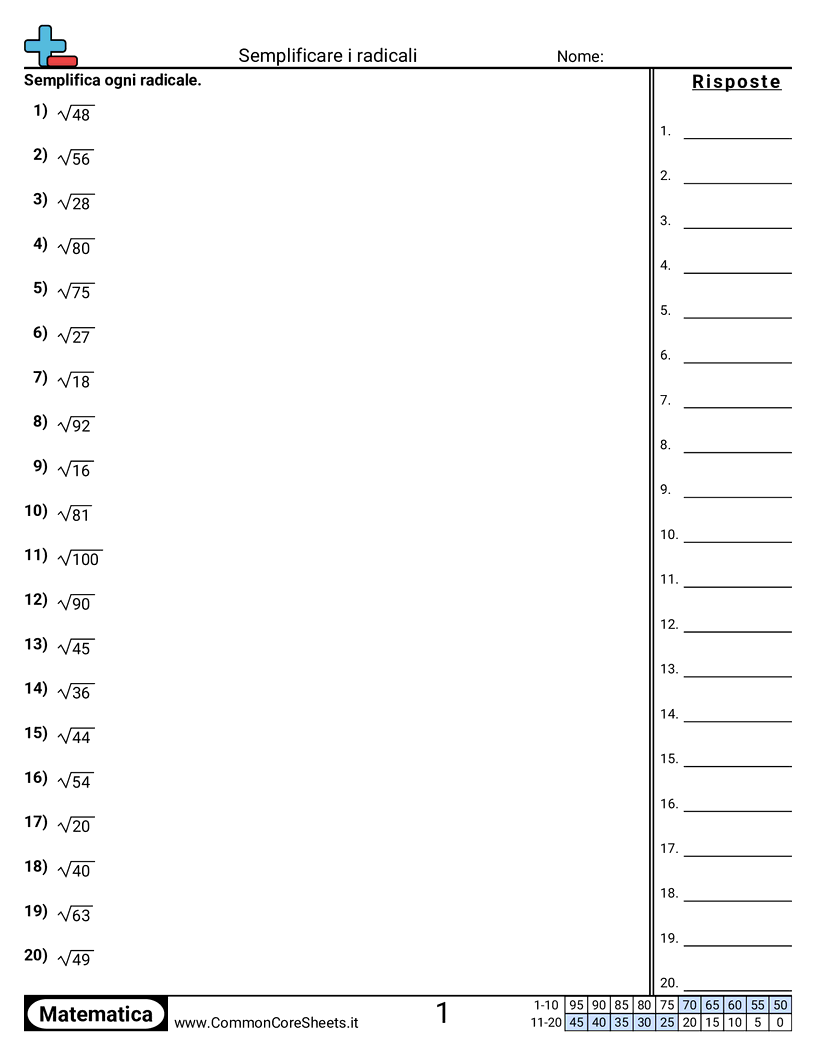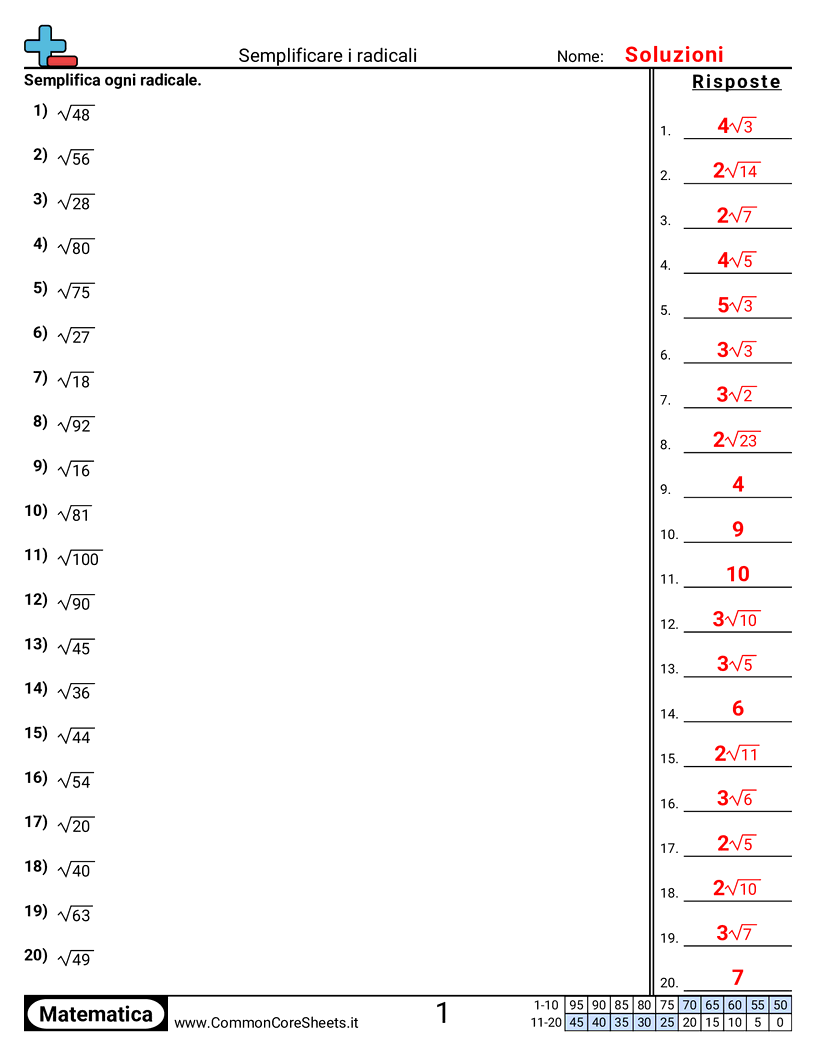 Schede di lavoro gratuite di math per 3ª Media (8ns2) su Semplificare i radicali. Ogni scheda contiene 20 esercizi con soluzioni ed è ideale per insegnanti e istruzione a casa. Puoi scaricare il PDF, creare flashcard o impostarlo per l'apprendimento online.