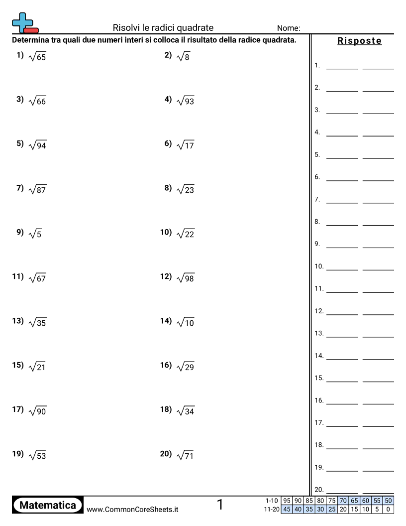 Ogni foglio di lavoro comprende 20 problemi in cui determinare tra quali due numeri interi si colloca il risultato delle radici quadrate.
